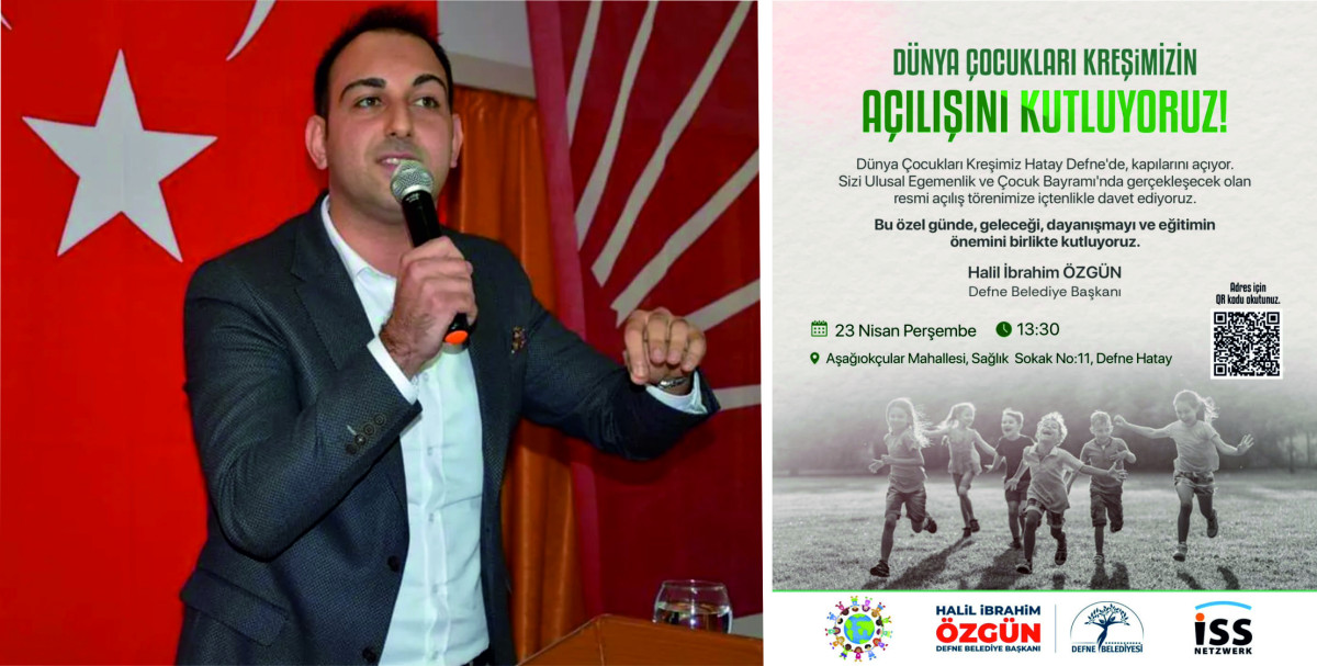 Defne Belediye Başkanı Sayın Halil İbrahim Özgün, 23 Nisan Ulusal Egemenlik ve Çocuk Bayramı’nda, Dünya Çocukları Vakfı ve ISS Netzwerk iş birliğiyle ilçeye kazandırılan Dünya Çocukları Kreşi’nin açılışının gerçekleştirileceğini duyurarak tüm vatandaşları bu anlamlı törene davet etti.